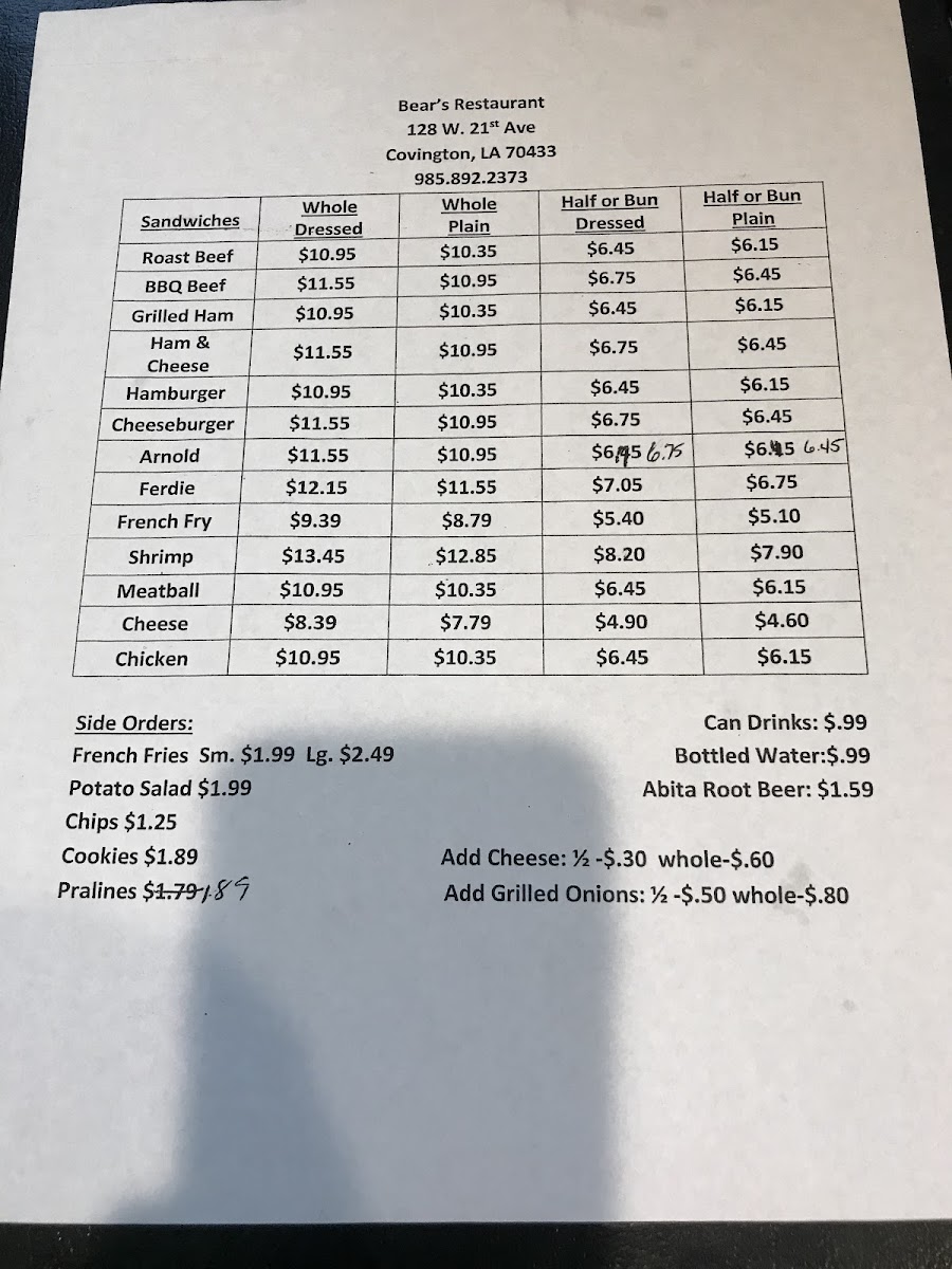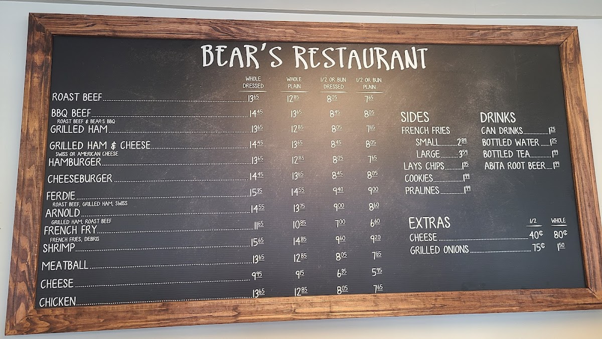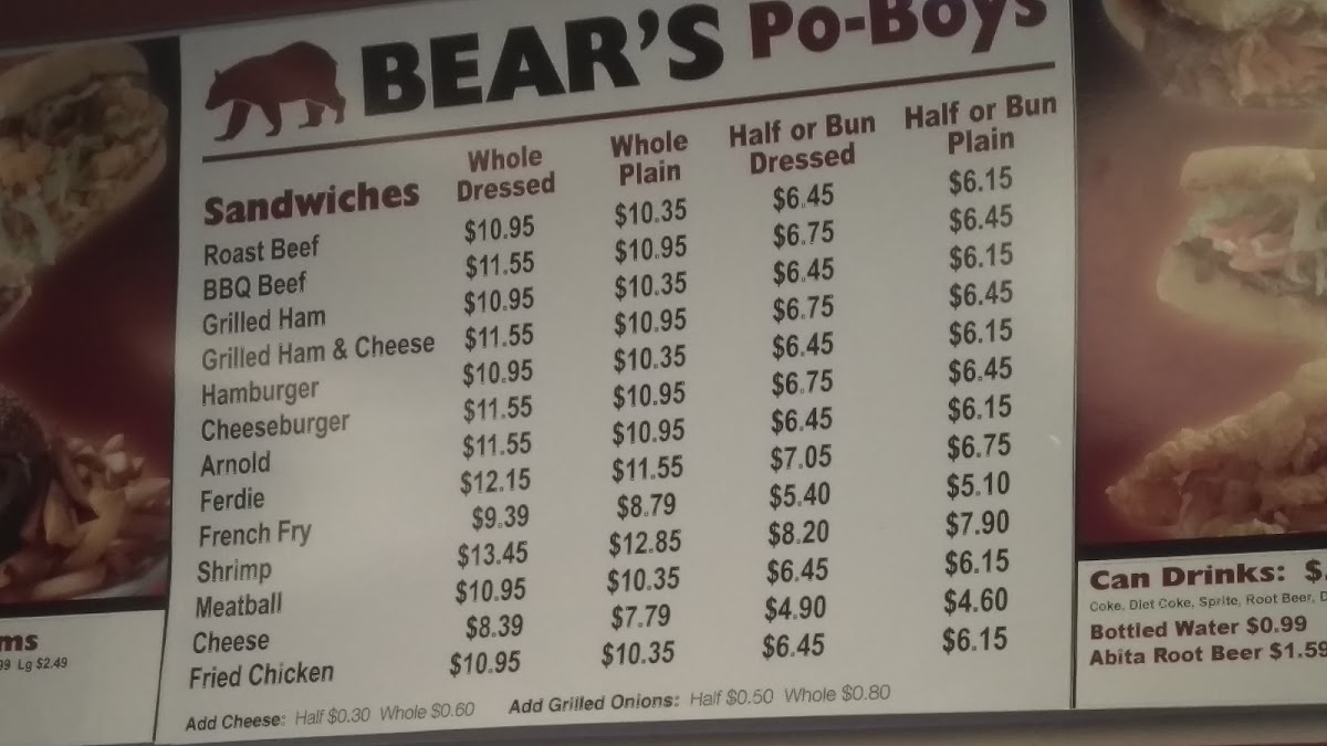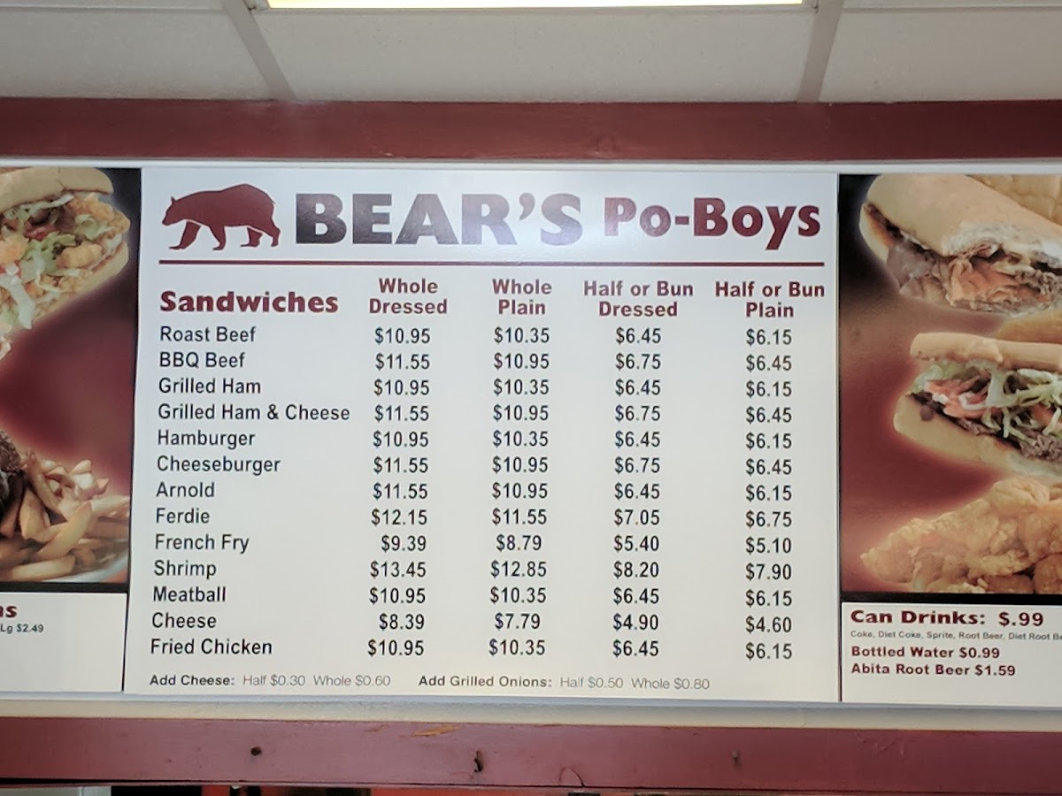 The menu at Bear's Restaurant features a variety of classic Po-Boys, which are the main focus of their offerings. Customers can choose from several options including Roast Beef, Shrimp, BBQ Beef, Cheeseburger, Hamburger, Ferdie, and Arnold Po-Boys, available as whole or half servings. These sandwiches are typically served with traditional fillings and dressings that are commonly associated with Po-Boys.